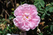 Damask Perpetual, Hybrid Spinosissima. White, light pink shading. [Light pink.]. Moderate fragrance. Medium to large, very full (41+ petals), flat bloom form. Occasional repeat later in the season. USDA zone 3b through 9b. Height of 6' to 8' (185 to 245 cm). James Lee (1821).