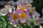 Shrub. White, pink edges, pink reverse, yellow stamens. Strong fragrance. Single (4-8 petals) bloom form. Blooms in flushes throughout the season. USDA zone 5b through 9b. Height of 4' to 5' (120 to 150 cm). Kleine Lettunich (1994).