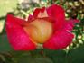 Hybrid Tea.  Cherry-red, yellow reverse, ages to carmine-pink .  Strong, fruity, lemon, rose, wild rose fragrance.  Large, full (26-40 petals), borne mostly solitary, reflexed bloom form.  Blooms in flushes throughout the season.  USDA zone 6b and warmer.  Height of 28" to 39" (70 to 100 cm).  Width of up to 30" (up to 75 cm). Alain Meilland (1940-....) (1996).