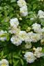 Hybrid Noisette, Shrub. White, yellow stamens. Small, very double, in large clusters, flat bloom form. Blooms in flushes throughout the season. Height: up to 5'11" (up to 180cm). Width: up to 4'11" (up to 150cm).