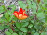 Hybrid Hulthemia persica, Shrub. Red blend. Bright yellow buds open to Chinese red inside with a deep red eye. None / no fragrance. Medium-large, single (4-8 petals), cluster-flowered, in small clusters bloom form. Blooms in flushes throughout the season. USDA zone 6b through 9b (default). Height of 3' to 5' (90 to 150 cm). Width of up to 3' (up to 90 cm). Ralph S. Moore (2006).