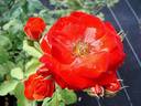 Floribunda. Orange, darker outer petals. Moderate fragrance. Medium, double (17-25 petals), cluster-flowered bloom form. Blooms in flushes throughout the season. USDA zone 5b and warmer. Height of 31" to 39" (80 to 100 cm). Width of 2' (60 cm). Gerrit De Ruiter (1958).