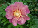 Intersectional Hybrid / Itoh. Peach - pink, deep pink flares. Yellow stamens. Semi-double bloom form. USDA zone 3a through 8a. Height: up to 3' (up to 90cm). Width: up to 3' (up to 90cm).
