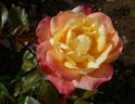 Hybrid Tea / Large-Flowered.  Yellow and pink.  Flowers peach yellow, fading to reddish.  Strong fragrance.  Large, full (26-40 petals), borne mostly solitary bloom form.  Blooms in flushes throughout the season.  USDA zone 7b and warmer.  Height of 3' (90 cm).   W. Kordes & Sons (1999).
