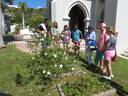 2016. The same plant photographed in 2012, with four years' growth on it. In the cemetery of the Church of the Holy Trinity, Bermuda, on the child's grave where the plant was originally discovered. Here, Liesbeth Cooper (in blue) shows the plant to a group of Florida Southern College students.