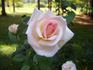 Hybrid Tea.  Light pink, darker center.  Flowers pink blend, smooth, veined.  Strong, spice, opinions vary fragrance.  Very large, very double, borne mostly solitary, in small clusters, high-centered bloom form.  Blooms in flushes throughout the season.  USDA zone 6b through 9b (default).