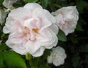 Damask Perpetual, Hybrid Spinosissima. White, light pink shading. [Light pink.]. Moderate fragrance. Medium to large, very full (41+ petals), flat bloom form. Occasional repeat later in the season. USDA zone 3b through 9b. Height of 6' to 8' (185 to 245 cm). James Lee (1821).