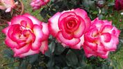 Floribunda / Cluster Flowered. Pink and white, red edges, yellow center. None to mild fragrance. Very large, very double, borne mostly solitary, in small clusters, high-centered bloom form. Blooms in flushes throughout the season. USDA zone 6b through 9b (default). Height of 2' to 39" (60 to 100 cm). Width of 20" to 2' (50 to 60 cm). Michel Adam (2005).