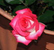 Miniature. White, red edges, white reverse. None / no fragrance. Medium-large, double (17-25 petals), borne mostly solitary, exhibition, high-centered bloom form. Blooms in flushes throughout the season. Height of 18" to 30" (45 to 75 cm). Frank A. Benardella (2004).