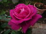 Floribunda.  Mauve.  Flowers reddish-purple.  Strong fragrance.  Large, full (26-40 petals), in small clusters, flat, ruffled bloom form.  Blooms in flushes throughout the season.  USDA zone 6b and warmer.