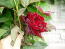 Hybrid Tea. Dark red, darker veining. Moderate fragrance. Large, full (26-40 petals), borne mostly solitary, high-centered bloom form. Blooms in flushes throughout the season. USDA zone 6b and warmer. Height of 3' to 5' 7" (90 to 170 cm). Width of 2' (60 cm). Hans Jürgen Evers (1940-2007) (1988).