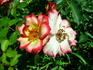 Floribunda. Red and white, red edges, lemon-yellow stamens. Strong, fruity fragrance. Medium to large, semi-double (9-16 petals), cluster-flowered, in small clusters bloom form. Prolific, blooms in flushes throughout the season. USDA zone 6b through 10b. Height of 3' to 5' (90 to 150 cm). Width of 3' to 4' (90 to 120 cm). Tom Carruth (1999).