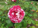 Floribunda. Red, white stripes. Flowers striped burgandy and white, or cream, or red, opening quickly. Mild to strong, damask, rose, spice, opinions vary fragrance. Large, double (17-25 petals), cluster-flowered, in small clusters bloom form. Blooms in flushes throughout the season. USDA zone 6b through 9b (default). Height: 35" to 47" (90 to 120cm). Width: 31" to 43" (80 to 110cm). Tom Carruth (1996).