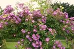 Climber, Hybrid Multiflora, Polyantha, Cl., Rambler. Violet, white streaks, stripes, flecks, white center, yellow stamens. Moderate, green apple, lily of the valley fragrance. Small to medium, semi-double (9-16 petals), cluster-flowered, in large clusters, cupped-to-flat bloom form. Once-blooming spring or summer. USDA zone 4b and warmer. Height of 10' to 20' (305 to 610 cm). Width of up to 12' (up to 365 cm). J. C. Schmidt / Blumenschmidt (1909).