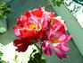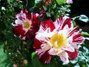 Floribunda, Cl., Large-Flowered Climber. Red blend, stripes. Apple, rose fragrance. Large, semi-double (9-16 petals) bloom form. Blooms in flushes throughout the season. USDA zone 6a through 9b. Height: 43" to 15' (110 to 455cm). Width: 26" to 6' (65 to 185cm). Tom Carruth (1999).
