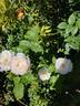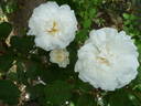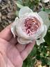 Shrub.  English Rose Collection.  White or white blend.  Flowers white, with a tendency to revert to pink.  Moderate, sweet fragrance.  Medium, very full (41+ petals), cluster-flowered, in small clusters, cupped, old-fashioned, rounded bloom form.  Prolific, blooms in flushes throughout the season.  USDA zone 5b through 10b.  Height of up to 4' (up to 120 cm).  Width of up to 4' (up to 120 cm). David C. H. Austin (1926-2018) (1988).