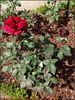 Hybrid Tea. Dark red, darker veining. Moderate fragrance. Large, full (26-40 petals), borne mostly solitary, high-centered bloom form. Blooms in flushes throughout the season. USDA zone 6b and warmer. Height of 3' to 5' 7" (90 to 170 cm). Width of 2' (60 cm). Hans Jürgen Evers (1940-2007) (1988).