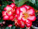 Floribunda. Red and white, red edges, lemon-yellow stamens. Strong, fruity fragrance. Medium to large, semi-double (9-16 petals), cluster-flowered, in small clusters bloom form. Prolific, blooms in flushes throughout the season. USDA zone 6b through 10b. Height of 3' to 5' (90 to 150 cm). Width of 3' to 4' (90 to 120 cm). Tom Carruth (1999).