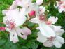 Floribunda, Shrub. Blush to white, red stamens. None / no fragrance. Medium, single (4-8 petals), in large clusters, cupped-to-flat bloom form. Prolific, continuous (perpetual) bloom throughout the season. USDA zone 6b through 9b (default). Height: 2' to 3' (60 to 90cm). Width: up to 4' (up to 120cm). Alain Meilland (1940-....) (2006).
