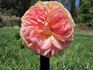 Hybrid Tea.  Light pink, salmon-pink undertones.  Strong, old rose, sweet fragrance.  Very large, full (26-40 petals), borne mostly solitary, high-centered, reflexed, ruffled, spiral centers bloom form.  Blooms in flushes throughout the season.  USDA zone 7b and warmer.