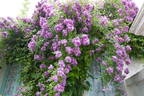Climber, Hybrid Multiflora, Polyantha, Cl., Rambler.  Violet, white streaks, stripes, flecks, white center, yellow stamens.  Moderate, green apple, lily of the valley fragrance.  Small to medium, semi-double (9-16 petals), cluster-flowered, in large clusters, cupped-to-flat bloom form.  Once-blooming spring or summer.  USDA zone 4b and warmer.  Height of 10' to 20' (305 to 610 cm).  Width of up to 12' (up to 365 cm). J. C. Schmidt / Blumenschmidt (1909).