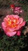 Hybrid Tea.  Orange-red, lemon-yellow reverse, rose-pink blending.  Strong, damask, rose, spice fragrance.  Large, very double, borne mostly solitary, in small clusters, high-centered bloom form.  Blooms in flushes throughout the season.  USDA zone 7b through 10b.  Height of 4' to 6' (120 to 185 cm).   Robert V. Lindquist (1963).