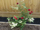 Climber, Hybrid Tea, Cl..  Dark red.  Strong fragrance.  Very large, very double bloom form.  Blooms in flushes throughout the season.  USDA zone 6b and warmer.  Height of 10' to 12' (305 to 365 cm).   Millar Bros. (1941), Naungayan (1946), Richardson (1944).