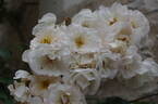 Hybrid Musk, Shrub.  White, pink undertones.  Moderate fragrance.  Small to medium, semi-double (9-16 petals), in large clusters, rosette bloom form.  Blooms in flushes throughout the season.  USDA zone 6b through 10b.  Height of 3' to 10' (90 to 305 cm).  Width of 4' to 5' (120 to 150 cm). Rev. Joseph Hardwick Pemberton (1919).