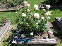 Floribunda. White, light pink edges, yellow undertones. Strong fragrance. Large, very full (41+ petals), in small clusters, cupped-to-flat, old-fashioned bloom form. Prolific, blooms in flushes throughout the season. USDA zone 5b through 9b. Height: 3' to 4' (90 to 120cm). Width: 2' to 28" (60 to 70cm). Jacques Mouchotte (2003).