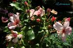Floribunda, Shrub. Blush to white, red stamens. None / no fragrance. Medium, single (4-8 petals), in large clusters, cupped-to-flat bloom form. Prolific, continuous (perpetual) bloom throughout the season. USDA zone 6b through 9b (default). Height: 2' to 3' (60 to 90cm). Width: up to 4' (up to 120cm). Alain Meilland (1940-....) (2006).