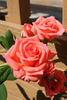 Hybrid Tea, Shrub. Vermilion. Mild fragrance. Double (17-25 petals), borne mostly solitary, in large clusters bloom form. Blooms in flushes throughout the season. USDA zone 6b and warmer. Height of 39" to 7' (100 to 215 cm). Width of 30" to 4' (75 to 120 cm). Harkness (1972).