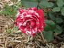Floribunda.  Red, white stripes.  Flowers striped burgandy and white, or cream, or red, opening quickly.  Mild to strong, damask, rose, spice, opinions vary fragrance.  Large, double (17-25 petals), cluster-flowered, in small clusters bloom form.  Blooms in flushes throughout the season.  USDA zone 6b through 9b (default).