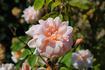 Hybrid Musk, Shrub.  Seashell-pink, yellow shading.  Strong fragrance.  Large, semi-double to double, in large clusters, open bloom form.  Blooms in flushes throughout the season.  USDA zone 5b through 10b.  Height of 40" to 8' (100 to 245 cm).  Width of 40" to 5' (100 to 150 cm). Rev. Joseph Hardwick Pemberton (1924).