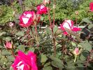 Polyantha.  White, rose-pink center, red shading.  Moderate fragrance.  Large, very double, cluster-flowered, in small clusters bloom form.  Prolific, blooms in flushes throughout the season.  USDA zone 5b through 9b.