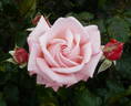 Hybrid Tea. Light pink, salmon-pink undertones. Strong, old rose, sweet fragrance. Very large, full (26-40 petals), borne mostly solitary, high-centered, reflexed, ruffled, spiral centers bloom form. Blooms in flushes throughout the season. USDA zone 7b and warmer. Height: 30" to 5' (75 to 150cm). Width: 2' (60cm). Samuel Darragh (1932-2019) McGredy IV (1985).