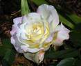 Floribunda. White, light pink edges, yellow undertones. Strong fragrance. Large, very full (41+ petals), in small clusters, cupped-to-flat, old-fashioned bloom form. Prolific, blooms in flushes throughout the season. USDA zone 5b through 9b. Height: 3' to 4' (90 to 120cm). Width: 2' to 28" (60 to 70cm). Jacques Mouchotte (2003).