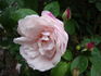 Tea. White, pink shading, pink edges, pink center, ages to blush . White washed with flesh pink, changing to 'salmony' white.. Moderate fragrance. Medium, double (17-25 petals), cupped, scalloped bloom form. Blooms in flushes throughout the season. USDA zone 6b through 10b. Height of 2' to 6' (60 to 185 cm). Width of 30" to 4' (75 to 120 cm). Joseph Schwartz (1880).