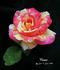 Hybrid Tea. White, pink stripes, salmon-yellow stripes. Moderate, spice fragrance. Large, full (26-40 petals), borne mostly solitary, high-centered to flat, reflexed bloom form. Continuous (perpetual) bloom throughout the season. USDA zone 5b and warmer. Height of 5' (150 cm). Width of up to 4' (up to 120 cm). Dr. Keith W. Zary (2000).