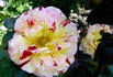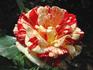 Floribunda.  Yellow, red stripes, cream stripes, pink stripes.  Strong, citrus, fruity fragrance.  Large, full (26-40 petals), cluster-flowered, in small clusters bloom form.  Blooms in flushes throughout the season.  USDA zone 3b through 10b.  Height of 30" to 42" (75 to 105 cm).   Tom Carruth (1996).