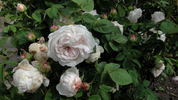 China / Bengale, Hybrid Moschata, Noisette.  Light pink, ages to white .  Bud crimson; flowers pinkish white, tinted lilac.  Moderate, clove fragrance.  Medium, full (26-40 petals), cluster-flowered, in large clusters bloom form.  Blooms in flushes throughout the season.  USDA zone 6b through 9b (default).