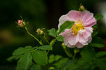 Shrub. Parkland Series Collection. Light pink, ages to cream . Mild fragrance. Medium, very full (41+ petals), cluster-flowered, in small clusters, flat, ruffled bloom form. Blooms in flushes throughout the season. USDA zone 3a and warmer. Height of 30" to 4' (75 to 120 cm). Width of 20" (50 cm). Henry H. Marshall (1976).