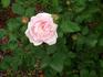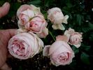 Floribunda, Hybrid Tea.  Pink, blush outer petals.  Strong fragrance.  Large, very full (41+ petals), borne mostly solitary, cupped, old-fashioned, quartered bloom form.  Blooms in flushes throughout the season.