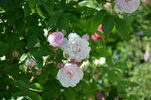 China / Bengale, Hybrid Moschata, Noisette.  Light pink, ages to white .  Bud crimson; flowers pinkish white, tinted lilac.  Moderate, clove fragrance.  Medium, full (26-40 petals), cluster-flowered, in large clusters bloom form.  Blooms in flushes throughout the season.  USDA zone 6b through 9b (default).