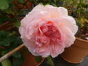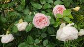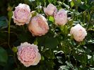 Shrub.  English Rose Collection.  Light pink.  Moderate, tea rose fragrance.  Medium, very full (41+ petals), in small clusters, cupped-to-flat, old-fashioned, quartered, rosette, ruffled bloom form.  Blooms in flushes throughout the season.  USDA zone 5b through 10b.  Height of up to 41" (up to 105 cm).  Width of up to 35" (up to 90 cm). David C. H. Austin (1926-2018) (1994).