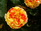 Floribunda, Hybrid Tea, Shrub. Orange and yellow, streaks, stripes, flecks, ages to peach . Some fading. Mild, fruity fragrance. Full (26-40 petals), cluster-flowered, in small clusters bloom form. Blooms in flushes throughout the season. USDA zone 7b and warmer. Height of 30" to 10' (75 to 305 cm). Width of up to 2' (up to 60 cm). Samuel Darragh (1932-2019) McGredy IV (1985).