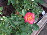 Miniature. Deep yellow, red edges, ages to red . None / no fragrance. Large, full (26-40 petals), borne mostly solitary, cluster-flowered, in small clusters, classic hybrid tea, exhibition, high-centered bloom form. Prolific, blooms in flushes throughout the season. USDA zone 4b through 11. Height of 1' to 22" (30 to 55 cm). F. Harmon Saville (1924-1997) (1984).
