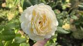 Found Rose, Tea. Cream, blush shading, darker outer petals, yellow undertones. Strong fragrance. Large, double (17-25 petals) bloom form. Blooms in flushes throughout the season. USDA zone 6b through 9b (default). Height of 5' to 12' (150 to 365 cm). Width of 5' (150 cm). Richard Bagg (1908).