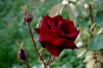 Hybrid Tea / Large-Flowered. Dark red. Velvety black-red. None to mild fragrance. Large, full (26-40 petals), borne mostly solitary bloom form. Blooms in flushes throughout the season. USDA zone 6b through 9b (default). Height of up to 32" (up to 80 cm). W. Kordes & Sons (1992).