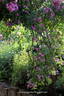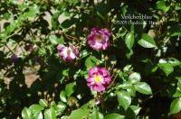 Climber, Hybrid Multiflora, Polyantha, Cl., Rambler. Violet, white streaks, stripes, flecks, white center, yellow stamens. Moderate, green apple, lily of the valley fragrance. Small to medium, semi-double (9-16 petals), cluster-flowered, in large clusters, cupped-to-flat bloom form. Once-blooming spring or summer. USDA zone 4b and warmer. Height of 10' to 20' (305 to 610 cm). Width of up to 12' (up to 365 cm). J. C. Schmidt / Blumenschmidt (1909).