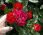 Floribunda. Cherry-red. Mild to strong fragrance. Medium, very full (41+ petals), cluster-flowered, in small clusters, cupped, old-fashioned bloom form. Blooms in flushes throughout the season. USDA zone 5a and warmer. Height: up to 39" (up to 100cm). Width: up to 28" (up to 70cm). Tim Hermann Kordes (1997).